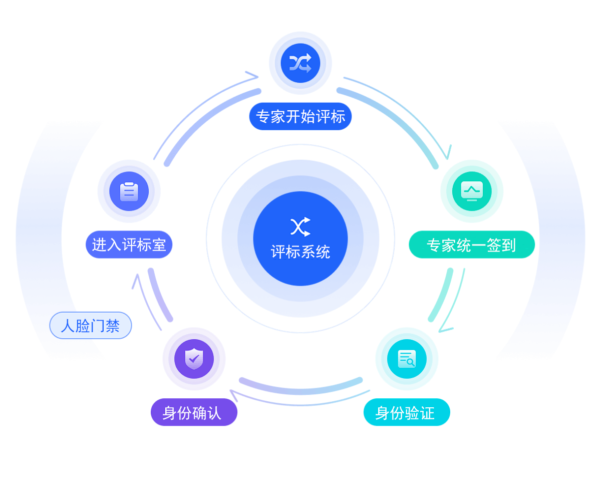采用人脸识别结合视觉技术对招标人、监督人、代理机构、评标专家统一签到鉴权。签到后可以刷脸进入指定区域和机位。项目评审过程中若出现未授权人员进入需授权区域,视觉系统会识别出未授权的人员的并立即主动语音提醒并告警,维护评审区域或监督区的秩序。